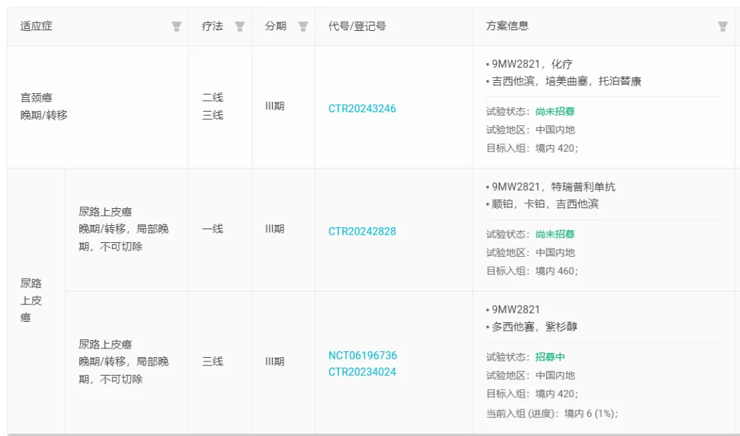 除了宫颈癌适应症外,9MW2821 还有两项 III 期临床正在开展中,分别为尿路上皮癌三线疗法和一线疗法。其中,三线疗法是 9MW2821 单药对照化疗,目标入组 420 例患者,在 2023 年 12 月启动;一线疗法是与特瑞普利单抗联用对照化疗,目标入组 460 例患者,在今年 8 月 13 日启动。