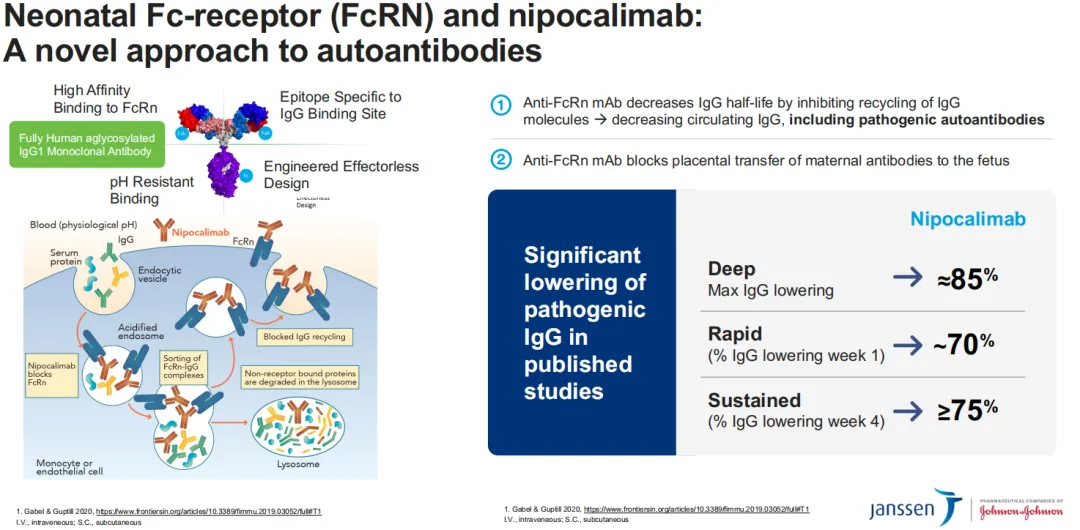 Nipocalimab是一款高亲和力、全人源、糖基化、无效应的单克隆抗体,可以选择性地阻断FcRn以降低循环免疫球蛋白G (IgG) 抗体的水平,包括导致多种疾病的自身抗体和异体抗体。