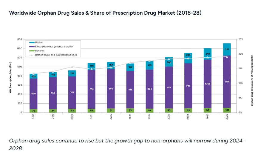 过去十多来,孤儿药的增长速度超过了非孤儿处方药,在全球处方药销售额中所占的份额翻了一番,从2014年的不到10%增至如今的近20%。预计孤儿药2024年的全球销售额将达到1850亿美元,到2028年将接近2700亿美元。