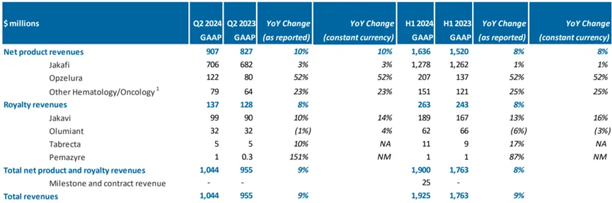 Incyte公司2024年H1总收入19.25亿美元,同比增长9%;其中Incyte最重要的产品JAK1/2抑制剂芦可替尼占所有产品总销售额的90%以上,其中Jakafi销售额达12.78亿美元,同比增长1%,Opzelura销售额为2.07亿美元,同比增长52%。Incyte预计Jakafi的销售额将从2023年的25.9亿美元增长到2024年的26.9亿至27.5亿美元。Evaluate预计2028该产品销售额42.35亿美元。
