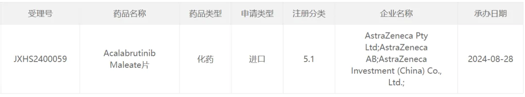 2023年3月,中国NMPA批准阿可替尼胶囊(acalabrutinib,商品名:Calquence/康可期)首次上市。用于治疗既往至少接受过一种治疗的成人套细胞淋巴瘤(MCL)患者,2023年8月,单药适用于既往至少接受过一种治疗的成人慢性淋巴细胞白血病(CLL)/小淋巴细胞淋巴瘤(SLL)患者,第2项适应症在中国获批;2024年8月28日,中国CDE官网最新公示,阿斯利康申报的acalabrutinib(通用名:阿可替尼胶囊,商品名:康可期)上市申请已获得受理:推测此次阿可替尼申报上市的新适应症可能是一线治疗慢性淋巴细胞白血病(CLL)。