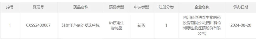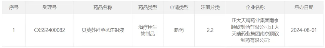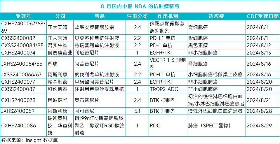 8 月 1 日,CDE 受理了正大天晴贝莫苏拜单抗注射液联合盐酸安罗替尼胶囊的新适应症上市申请,用于一线治疗晚期不可切除或转移性肾细胞癌(RCC),Insight 数据库预测该申请有望于明年第二季度获批。