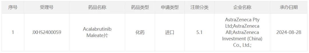 8 月 28 日,CDE 受理了阿斯利康 BTK 抑制剂阿可替尼片的新适应症上市申请。此前,阿可替尼胶囊已在国内获批治疗套细胞淋巴瘤 、单药适用于既往至少接受过一种治疗的成人慢性淋巴细胞白血病(CLL)/小淋巴细胞淋巴瘤(SLL)患者。根据该药的临床研究进度,推测阿可替尼片本次申请适应症可能为用于一线治疗慢性淋巴细胞白血病患者。Insight 数据库预测该申请有望于明年二季度获批。