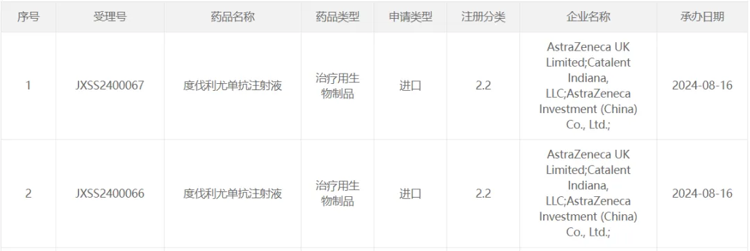 8 月 16 日,CDE 受理了阿斯利康 PD-L1 抑制剂度伐利尤单抗注射液的新适应症上市申请。此前度伐利尤单抗已在国内获批 3 项适应症,分别用于治疗 III 期非小细胞肺癌、广泛期小细胞肺癌、局部晚期或转移性胆道癌患者。