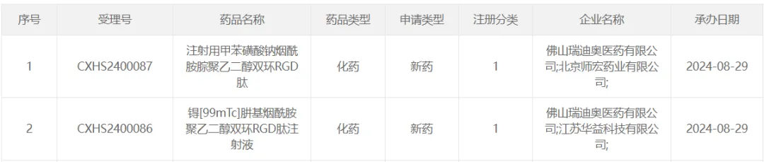8 月 29 日,CDE 受理了瑞迪奥科技和华益科技联合申报的锝 [99mTc] 肼基烟酰胺聚乙二醇双环 RGD 肽注射液(99mTc-3PRGD2)的上市申请。99mTc-3PRGD2 是一款以整合素为靶点的 RDC 药物, Insight 数据库推测该药本次申报上市拟用于肺部肿瘤良恶诊断及淋巴结转移诊断。