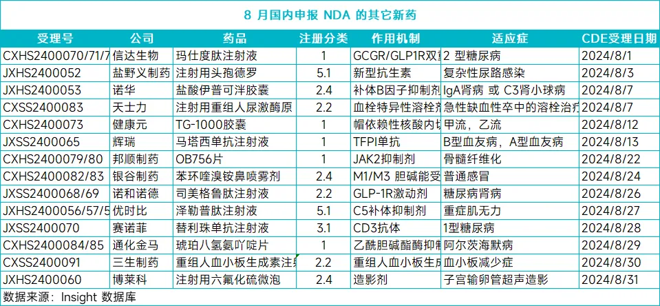 除了上述的抗肿瘤新药,8月还有许多其它治疗领域的新药也在中国申报上市或提交了新适应症NDA(见下表),适应症包括阿尔茨海默病、1型糖尿病、重症肌无力、骨髓纤维化、血友病、糖尿病肾病等等,限于篇幅,此处不再一一介绍。