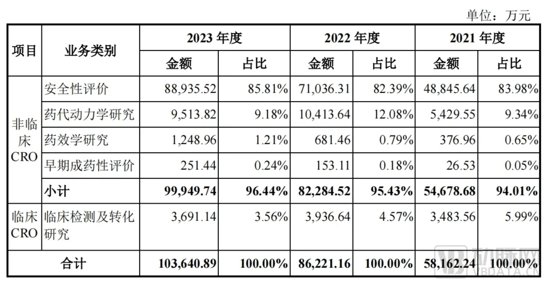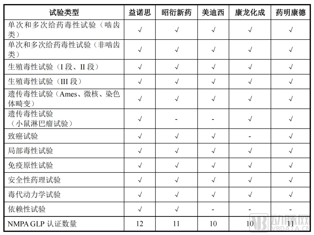 安评业务一直是益诺思商业版图最核心的部分,营收占比维持在80%上下。根据招股书,益诺思是国内最早同时具备NMPA的 GLP 认证、OECD的GLP认证、通过FDA的GLP检查的企业之一,建立了抗体类药物及抗体偶联药物免疫原性及免疫毒性评价关键技术平台。从招股书提供的信息看,在国内的安评CRO中,益诺思提供的试验类型最丰富,拿到的NMPA GLP认证数量也最多,在订单争夺中具备一定优势。