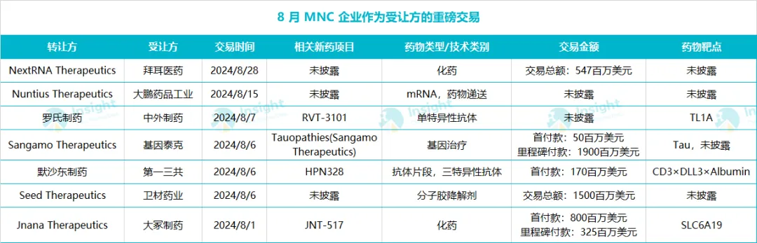 据 Insight 数据库显示,8 月共收录全球医药交易事件 81 条(包含终止交易事件,下同),其中,与中国企业相关的 license-out 跨境交易有 10 项,跨国药企(MNC)参与的交易事件有 24 项。