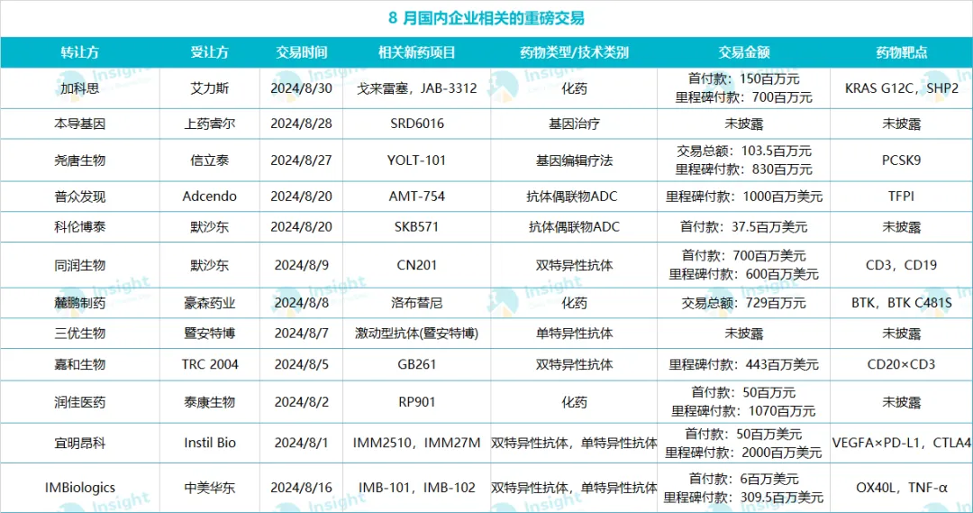 哪些中国企业发生重磅交易呢?本月,就国内企业 license-out 的交易事件来看,双抗以及 ADC 仍然是热门领域。