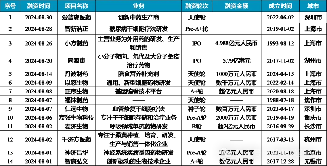 与此同时,国内生物医药行业也不甘落后,共有14家企业在8月份顺利完成了融资。这些企业涵盖了从细胞疗法到基因药物编辑的多个细分赛道,展现了国内生物医药行业的多元化和创新能力。