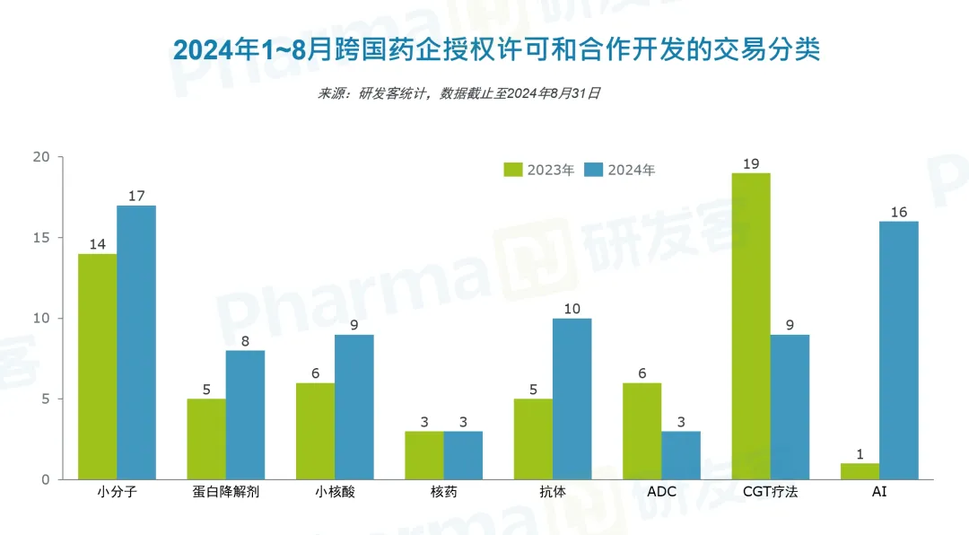 ADC、CGT疗法的交易在2024年迎来退潮期,双抗、小核酸、小分子药物等领域开始慢慢起势,放射性药物自2023下半年至今持续获得关注。