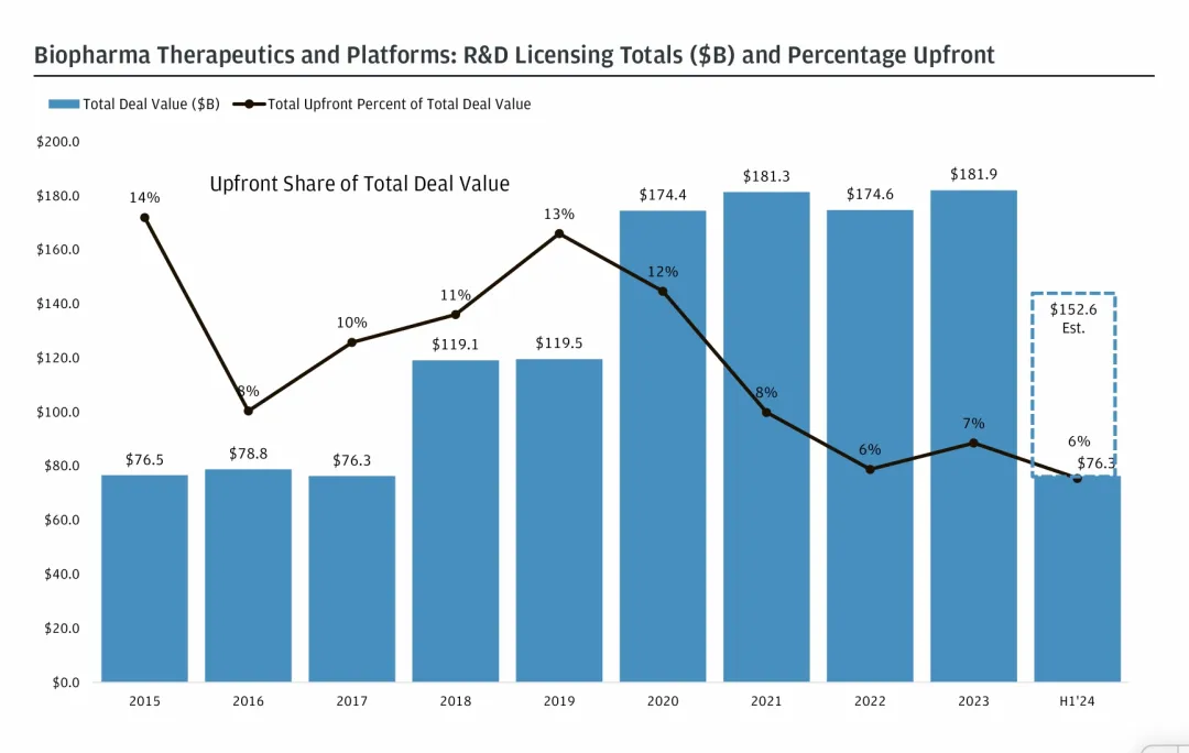 2023年同期也呈现同样趋势,预付款占交易总额的比例只有4.7%。J.P. Morgan统计结果如是,生物制药行业交易的预付款份额自2020年来呈下降趋势,其中2024年上半年的预付款比例是6%。