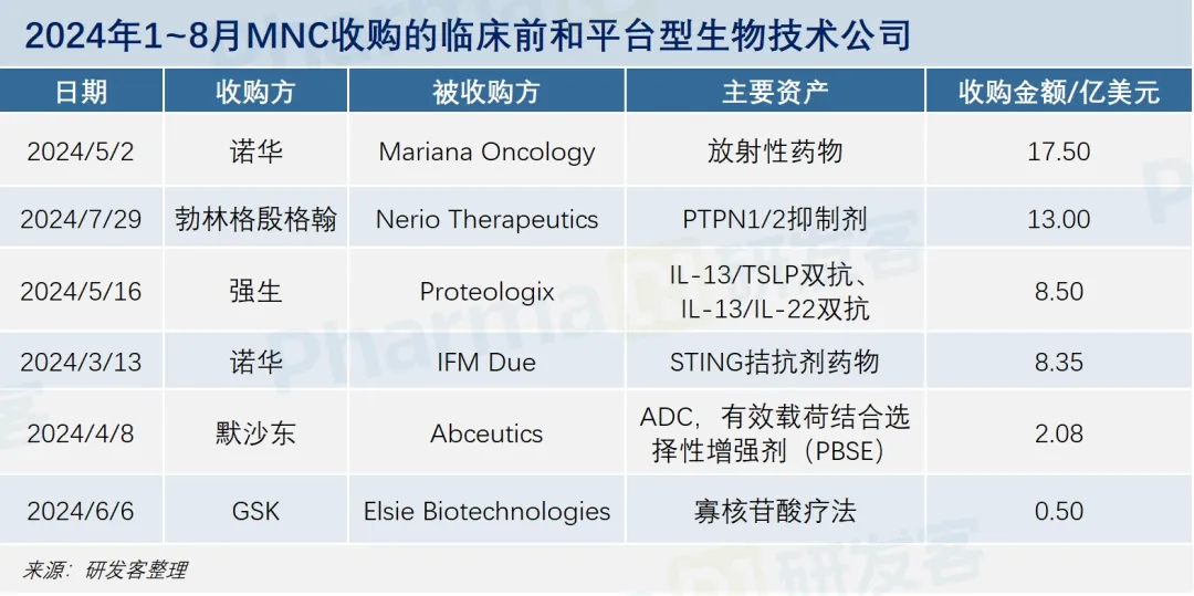 2024年至8月底MNC共发生了27例收购,相比2023年同期的15项数量有所增加,且大多是处于早期临床阶段、小体量的生物技术公司。27例收购中,处于2期及以前临床阶段的公司达20家,占比近75%,且临床前和平台型公司就有6家(见下表)。最高额的并购,是诺和诺德以165亿美元收购CDMO企业Catalent,其他并购均低于50亿美元。