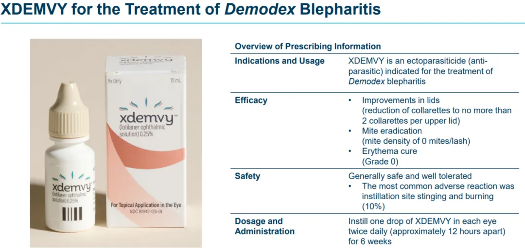 2023年7月,Tarsus Pharmaceuticals开发的XDEMVY(lotilaner滴眼液0.25%,中文名洛替拉纳)获得美国FDA批准用于治疗蠕形螨睑缘炎。据悉,该药物是美国FDA批准的首个也是目前唯一一个直接针对蠕形螨的治疗方法,蠕形螨是蠕形螨睑缘炎的根本原因。