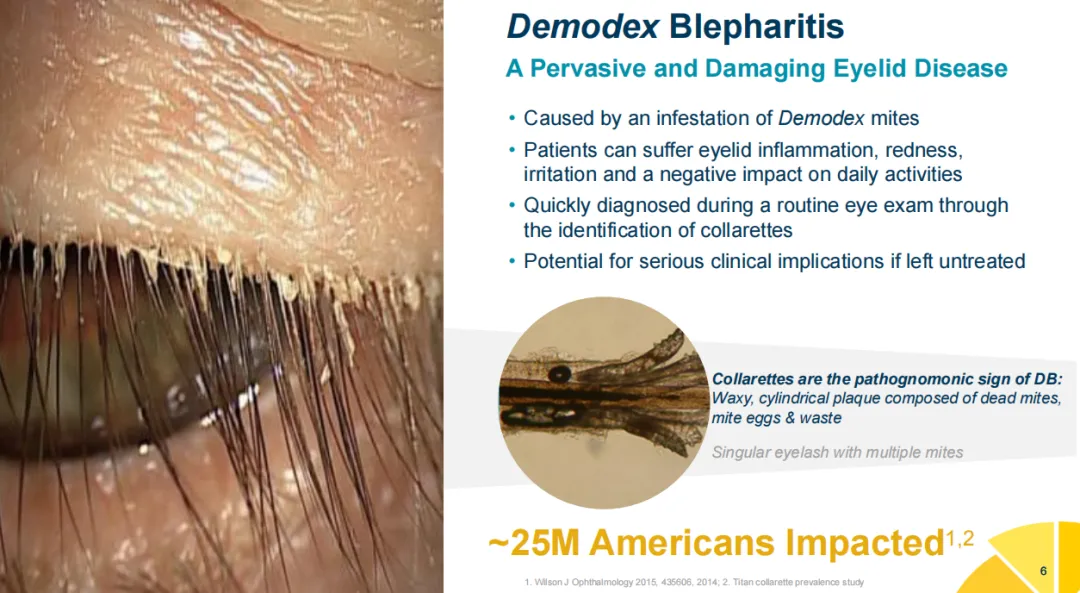 在此之前,蠕形螨睑缘炎通常通过各种非处方药治疗,如茶树油、眼睑湿巾和人工泪液,以及干眼症处方产品的超适应症用药。