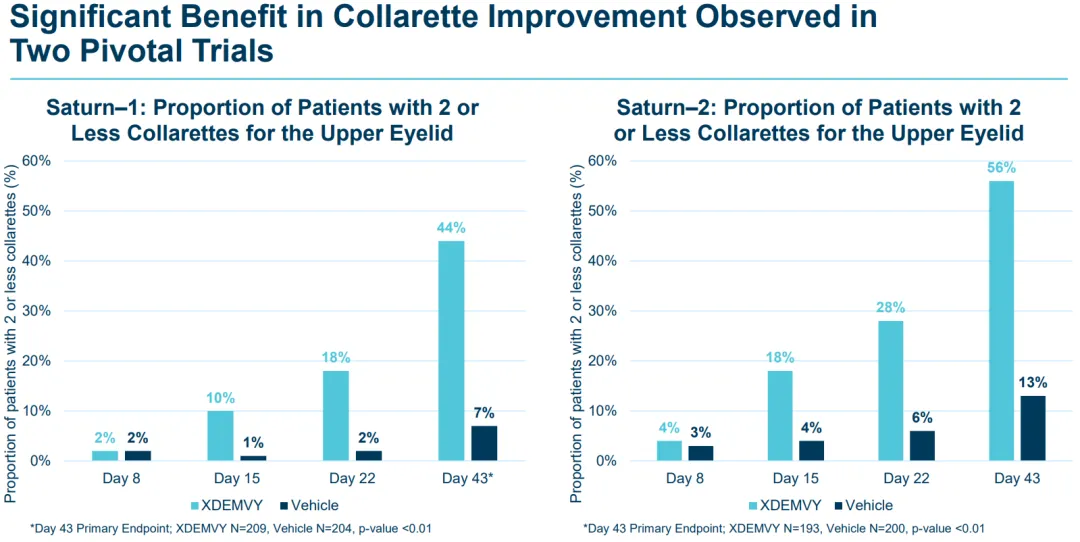 Lotilaner(TP-03)已在美国完成了两项关键临床研究,均达到了研究的主要终点和次要终点,且耐受性良好。Saturn-2研究招募了412名成人患者,研究显示XDEMVY(lotilaner滴眼液)治疗组有56%的患者实现改善(每个上眼睑袖套状分泌物少于2处)。Saturn-1研究招募了421名成人患者,研究显示XDEMVY(lotilaner滴眼液)治疗组有44%的患者实现改善。
