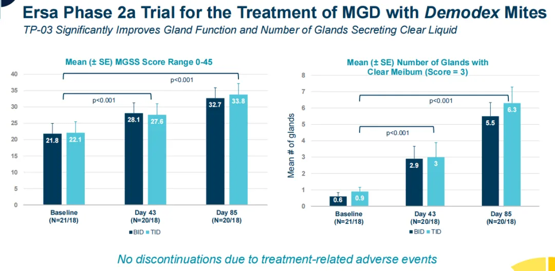 2023年12月,Tarsus报告了2a期临床试验Ersa的阳性终点结果,该试验评估了TP-03(0.25%),每天2次或每天3次,连续12周,用于治疗伴有蠕形螨感染的MGD患者的疗效,研究表明,与基线相比,TP-03治疗12周后在疾病的两个客观指标中实现了统计学意义和临床意义的改善,即通过睑板腺分泌评分(MGSS)测量液体分泌的存在和质量,以及分泌正常(透明)液体的腺体数量,且耐受性良好。Tarsus计划在2024年底前与FDA讨论并确定潜在的监管路径。