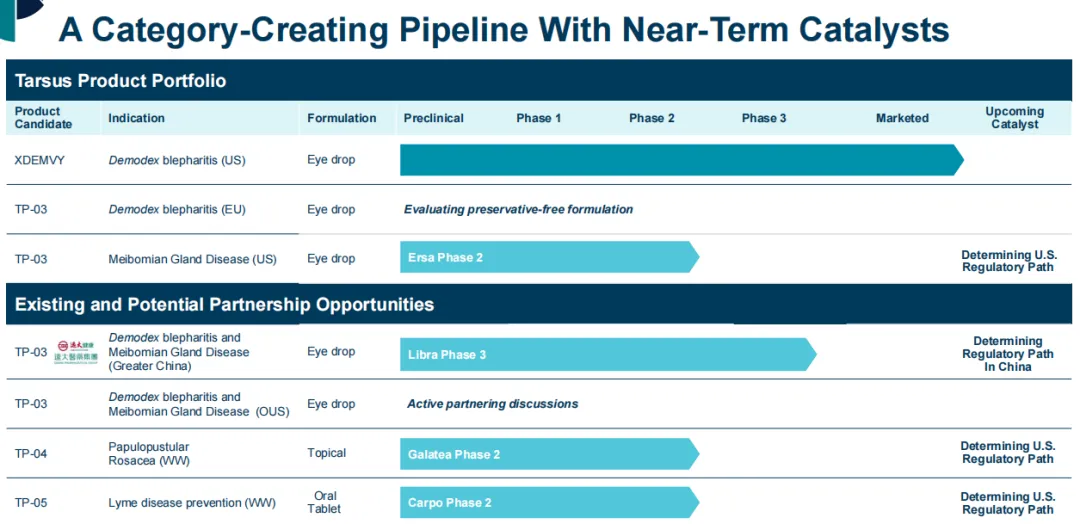 Tarsus正在推进其产品线,以解决一系列治疗需求未得到满足的疾病,包括眼部护理、皮肤病学和传染病预防。