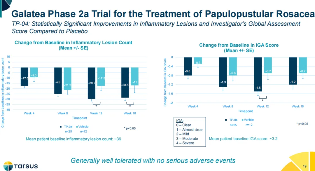 2024年2月,Tarsus宣布评估TP-04(一种新型lotilaner凝胶制剂)治疗丘疹脓疱型玫瑰痤疮(PPR)的2a期Galatea试验获得积极结果。该试验表明,与安慰剂组相比,TP-04治疗组在第12周时的炎症病变和研究者的整体评估(IGA)评分具有统计学意义上的改善(p<0.05),且总体耐受性良好。该公司计划在2024年底前与FDA讨论并确定潜在的监管路径。