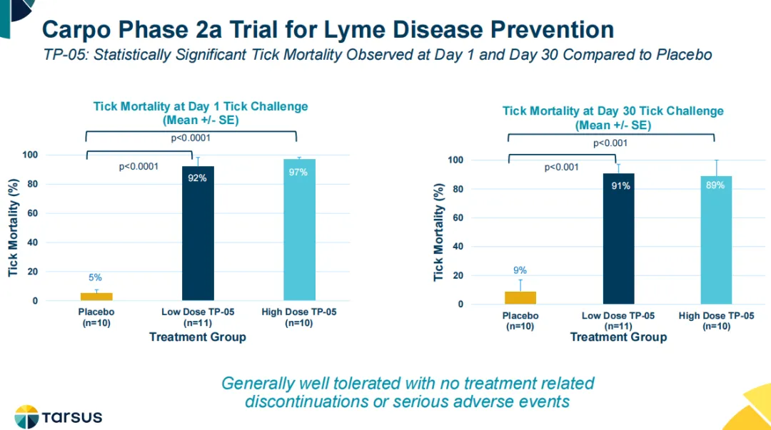 研究显示,与安慰剂相比,高剂量和低剂量的TP-05在杀死蜱虫方面都显示出统计学意义上的显著益处。具体来说,在给药后第1天蜱虫暴露后,TP-05高剂量和低剂量组的24小时平均蜱虫死亡率分别为97.0%和92.0%,而安慰剂组仅为5.0%;同样,在给药30天后的蜱虫暴露中,TP-05高剂量和低剂量组的24小时平均蜱虫死亡率分别为89.0%和91.0%,而安慰剂组仅为9.0%。两个TP-05治疗组之间在蜱虫死亡率方面未观察到统计学上的显著差异,并且TP-05通常耐受性良好。Tarsus计划在2024年底前与FDA讨论并确定潜在的监管路径。