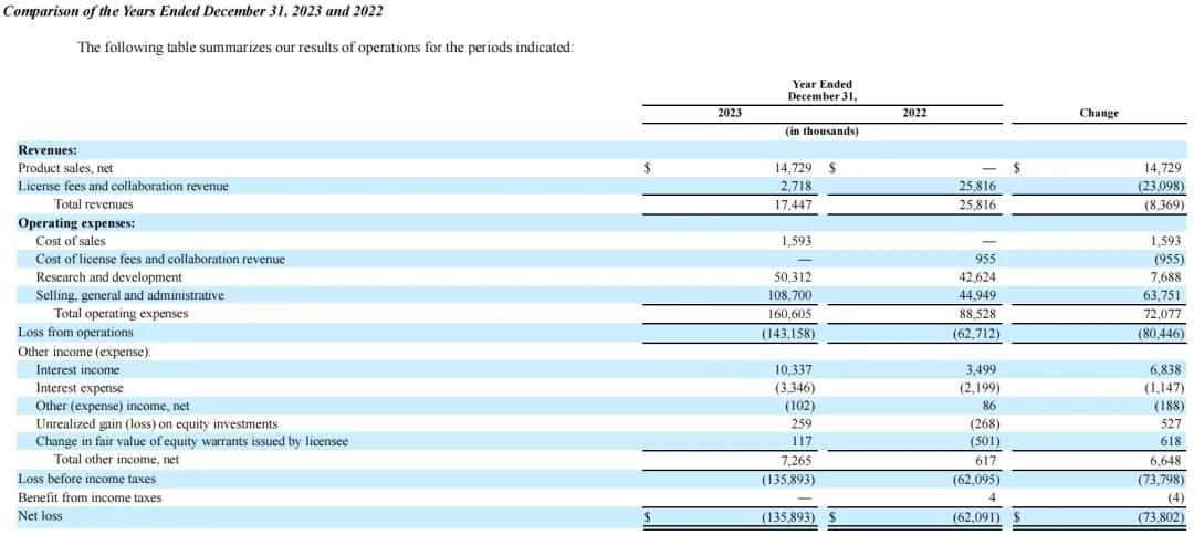 2023全年,Tarsus Pharmaceuticals总收入1740万美元,其中XDEMVY(lotilaner滴眼液0.25%)产品业绩为1470万美元(8月下旬推出后大约四个月的销售额);全年R&D费用为5030万美元;SG&A费用为1.087亿美元;净亏损为1.359亿美元。自从8月份推出之后,XDEMVY(lotilaner滴眼液0.25%)在整个2023年开出了大约17400张处方。