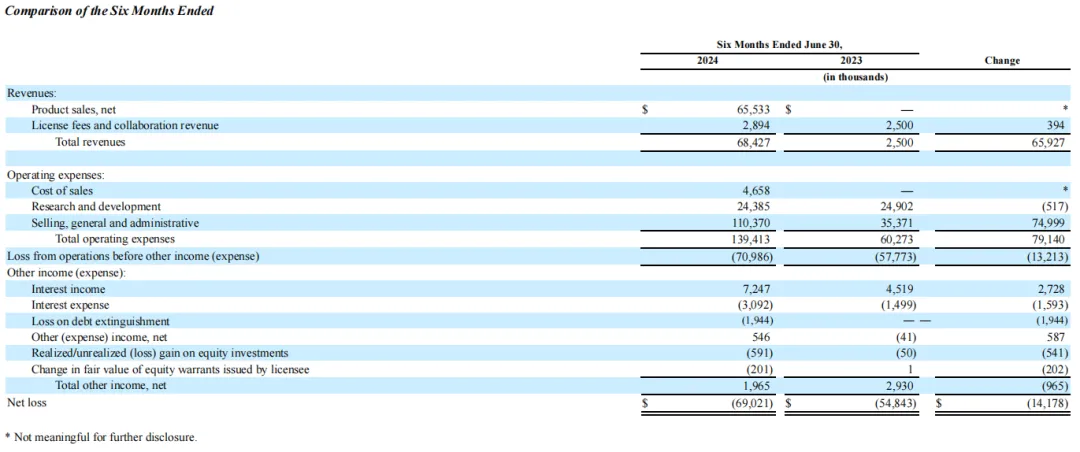 2024年上半年,Tarsus Pharmaceuticals总收入6840万美元,其中XDEMVY(lotilaner滴眼液0.25%)产品业绩为6550万美元(第二季度业绩为4080万美元,比第一季度增长65%);上半年R&D费用为2440万美元;SG&A费用为1.104亿美元;净亏损为6900万美元。上半年该公司卖出XDEMVY(lotilaner滴眼液0.25%)约63000瓶(第二季度37000瓶,单瓶净价格超过1000美元)。