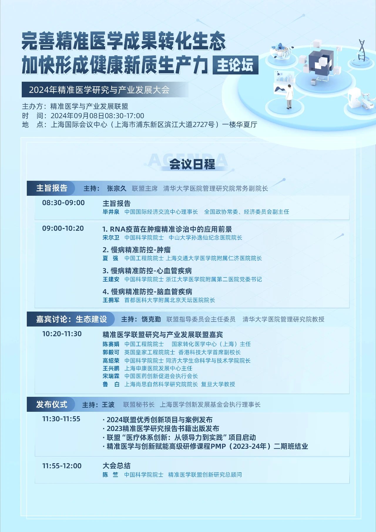 建设精准医学生态、搭建合作平台与网络,是精准医学研究与产业发展联盟的初心与使命。为践行这一使命,联盟经过一年多的探索与实践,紧密围绕原创研究、人才培养、创新转化三个核心关键词,积极探索,得到了政策制定者、基础研究者、临床专家、企业家和投资人等的大力支持,为此,联盟将于2024年9月8日在上海国际会议中心召开2024精准医学研究与产业发展大会,将聚焦“完善精准医学成果转化生态,加快形成健康新质生产力”主题。