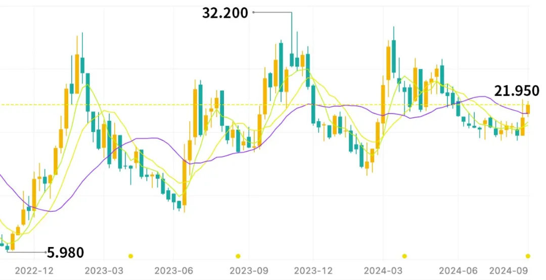 得益于两年来的一系列变革,资本市场对于云顶新耀的预期也在不断走高,2023年,其股价涨幅在18A上市的港股通企业中排行第二。截至发稿,云顶新耀的股价为21.95港元,较2022年10月的最低点5.98港元,涨幅超过了300%。