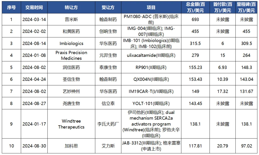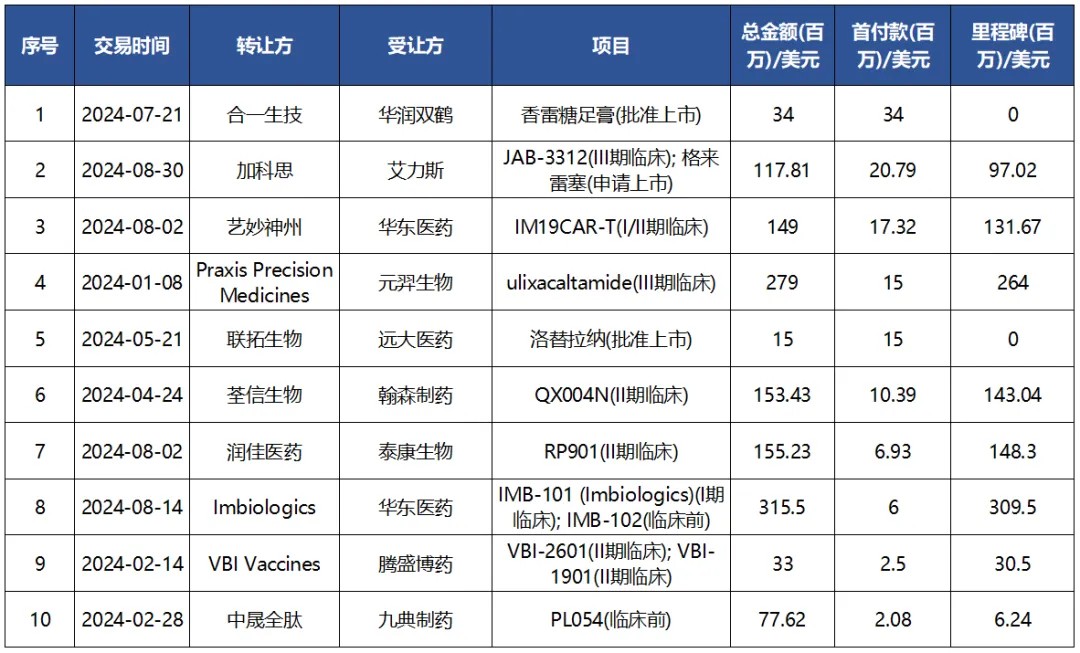 2024年(1-8月)中国创新药license-in交易TOP10(按首付款计)