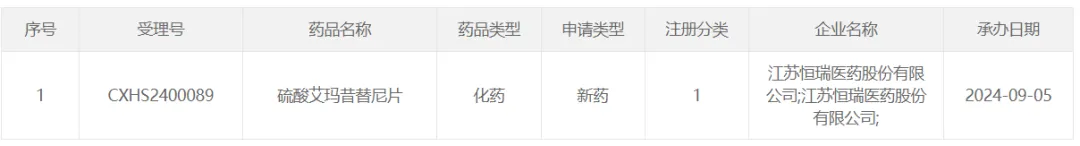 9 月 5 日,CDE 官网显示,恒瑞递交了硫酸艾玛昔替尼片的新适应症上市申请(CXHS2400089)。艾玛昔替尼此前已在国内递交了三项上市申请。根据该药的临床研究进度,Insight 数据库预测该申请适应症可能为斑秃。