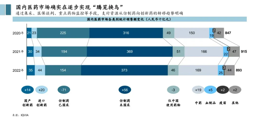 而节省下来的医保基金,一部分依旧转向了“进口药”。IQVIA的统计显示,国产创新药的销售额从2020年的21亿元增长到2022年的35亿元,而进口创新药从23亿元增长到44亿元。而整个仿制药的销售额在持续缩小。“不是所有的进口药都消失了,而是进口药的结构有所变化。”一位医保人士表示。