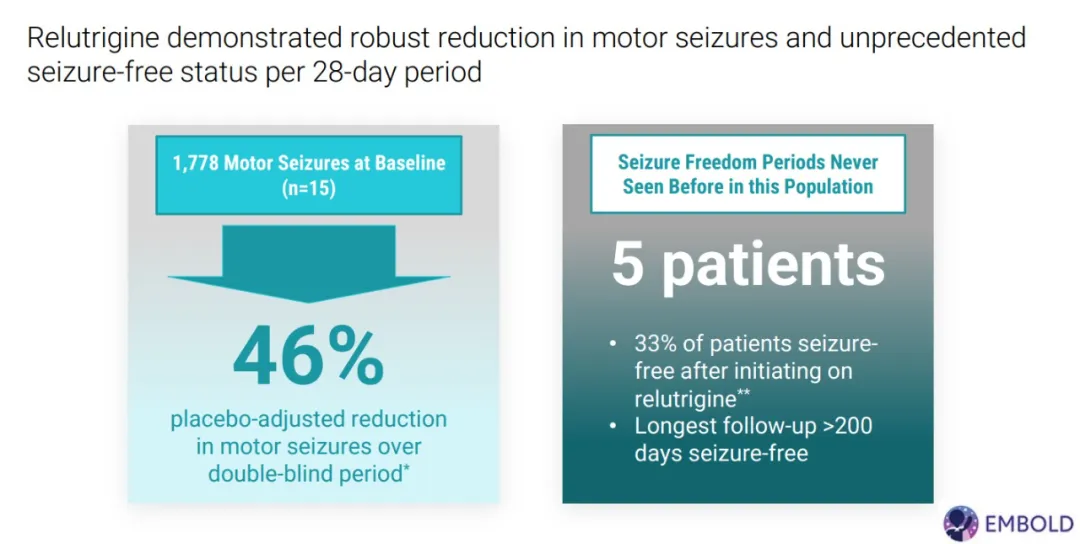 在疗效方面,接受relutrigine治疗的患者中,经安慰剂矫正的运动性癫痫发作次数与基线相比下降46%。值得一提的是,在接受relutrigine治疗的患者中,5名患者实现了28天无癫痫发作,而安慰剂组中无患者达成这一状态。