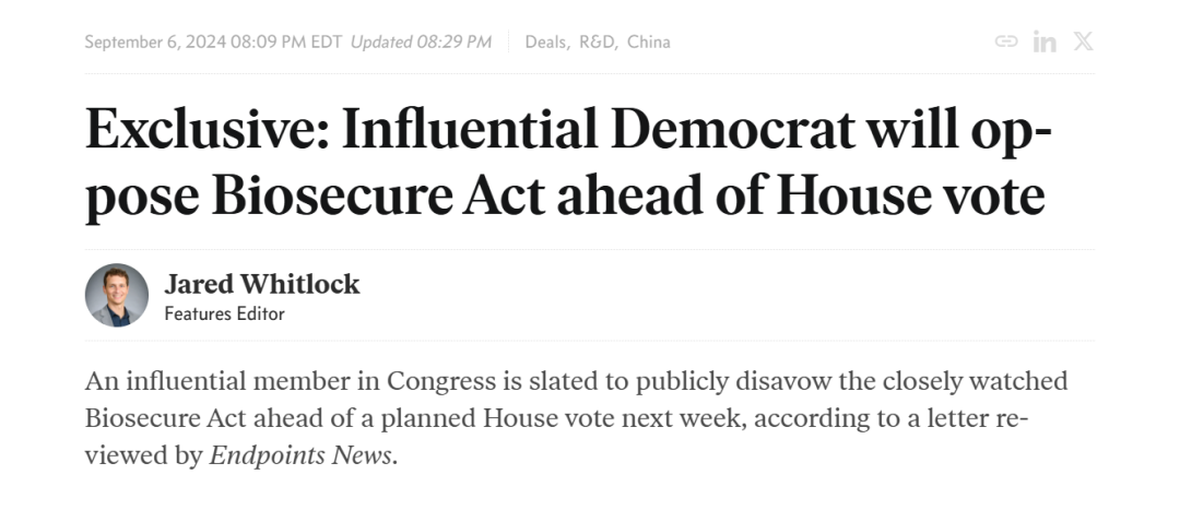 就在法案投票日期传开后,美东时间2024年9月6日晚上,Endpoints News发布一则重磅消息,称:有影响力的民主党国会议员将在众议院投票前反对《生物安全法案》。