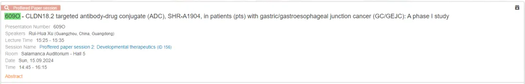 2024 年欧洲肿瘤内科学会(ESMO)年会将于当地时间 9 月 13 日至 17 日在西班牙巴塞罗那召开。恒瑞将在本次会议上以口头报告的形式首次公布 CLDN18.2 ADC 药物 SHR-A1904 治疗胃或胃食管交界处癌(GC/GEJC)的 I 期研究结果,目前该结果的摘要已经公布。