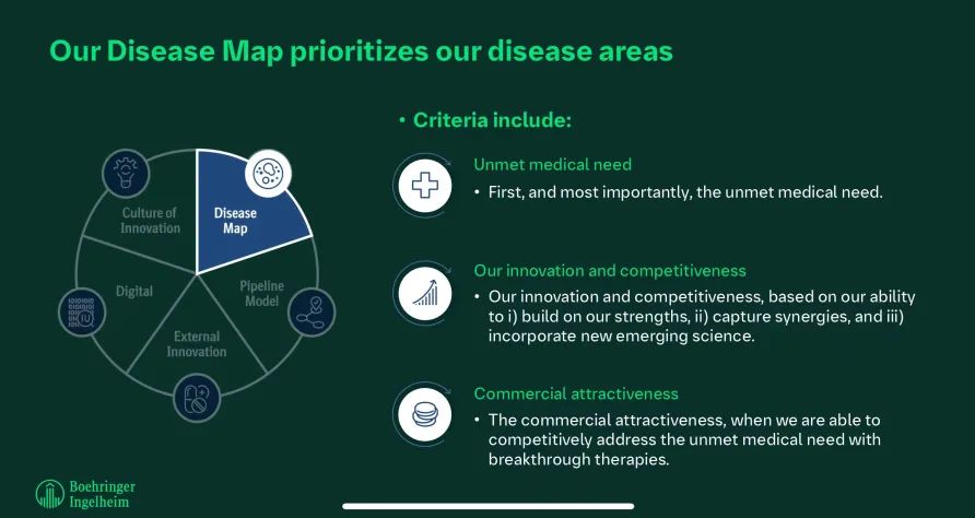 值得一提的是,勃林格殷格翰中国团队深度参与了全球疾病图谱绘制。公司的Disease mapping战略旨在明确研发方向,每五年进行一次,首要考虑未满足的临床需求,其次是创新和竞争环境,最后是商业市场吸引力。勃林格殷格翰从一万种未满足需求的疾病中筛选出51种作为战略关注的疾病,进一步确定13种作为研发重点,其中6种为首要重点,7种纳入战略储备,3种是新兴领域。所有疾病选定都基于深入的疾病生物学和基因学,疾病机制研究和分子靶标的选择。