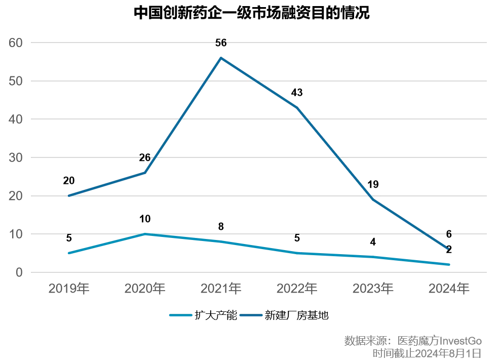 医药魔方InvestGO投融资数据库显示,历年国内创新药企一级市场融资目的中,将融资金额用于新建厂房基地的事件数,从2021年的56起锐减至了2023年同期的19起,锐减超6成,到2024年前8个月,此数量变为仅6起,扩大产能方面则在2020年后就开始一路走低。