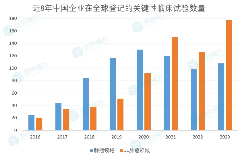 医药魔方TrialCube数据库显示,中国创新药企在全球登记的关键性临床数量从2021年起,非肿瘤领域开始反超肿瘤领域,并逐渐拉开差距。其中,自身免疫性疾病和代谢及内分泌领域成了市场新的心头好。