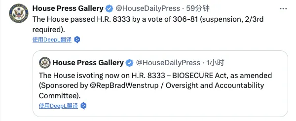 美国众议院当地时间9月9日宣布,以306票对81票通过了H.R.8333号法案,即《生物安全法案》(The Biosecure Act)。