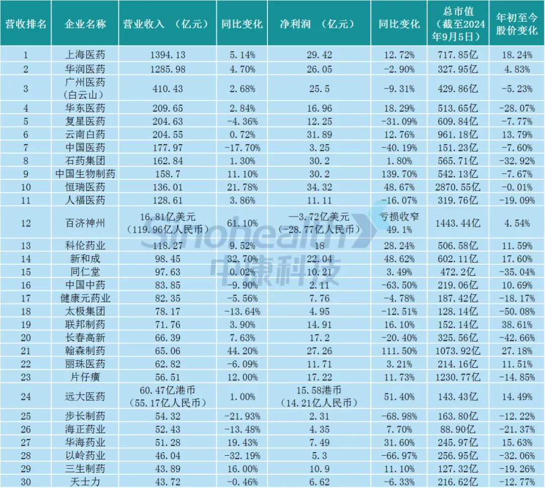 新康界根据国内上市医药企业2024年上半年营业收入及净利润等数据整理出TOP30榜单。