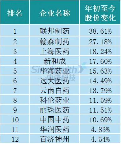 在股价表现方面,年初至今,有12家企业的股价实现正增长,联邦制药、瀚森制药、上海医药、新和成等企业表现突出。