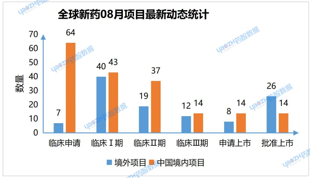 据药智数据「全球药物分析系统」统计,8月共698个药物有相关更新动态,其中有298个项目推进到最新的阶段,其中在中国境内进行的项目共186个,境外项目有112个。