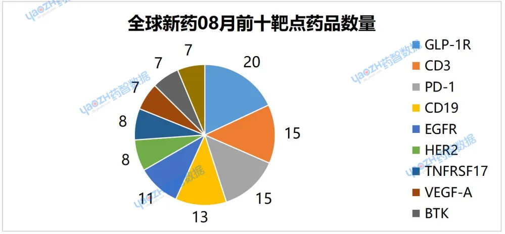 在新药研发靶点板块,8月有更新动态的698个项目中,涉及最多的靶点是GLP-1R,其次是CD3和PD-1,以下是排名前十的靶点,图中仅展示药品总数,具体药品内容可通过全球药物分析系统进行查看。