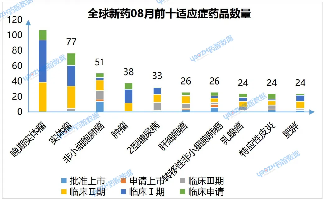 从适应症来说,8月有更新动态的698个项目中,涉及最多的适应症是晚期实体瘤,其次是实体瘤和非小细胞肺癌,以下是排名前十的适应症及其全球最高研发阶段情况,图中仅展示药品总数,具体药品内容可通过全球药物分析系统进行查看。