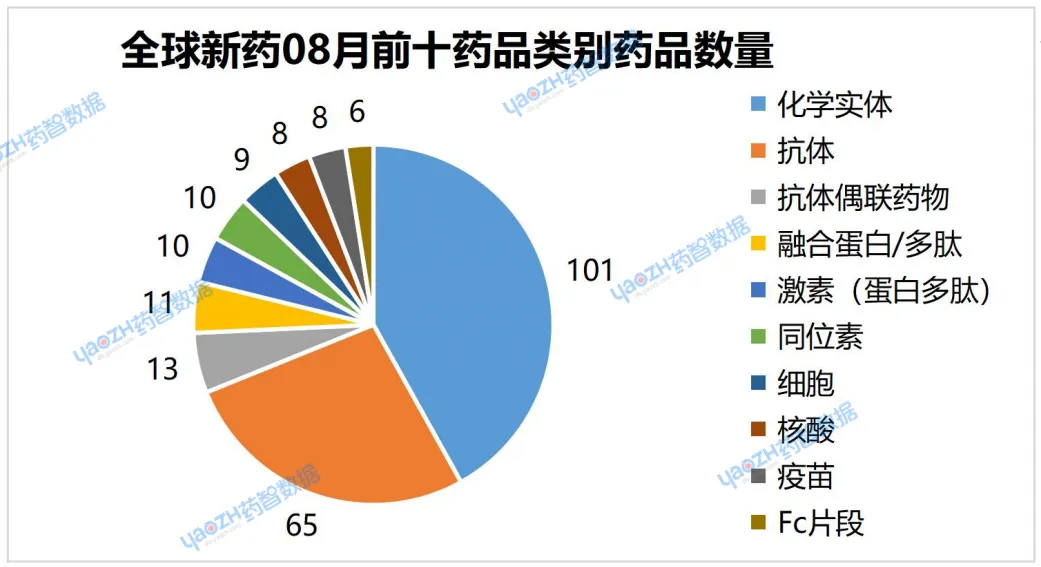 从成分类别分析,8月有最新进展的相关药品占比前三的分别是化学实体42%,抗体27%,抗体偶联药物5%。