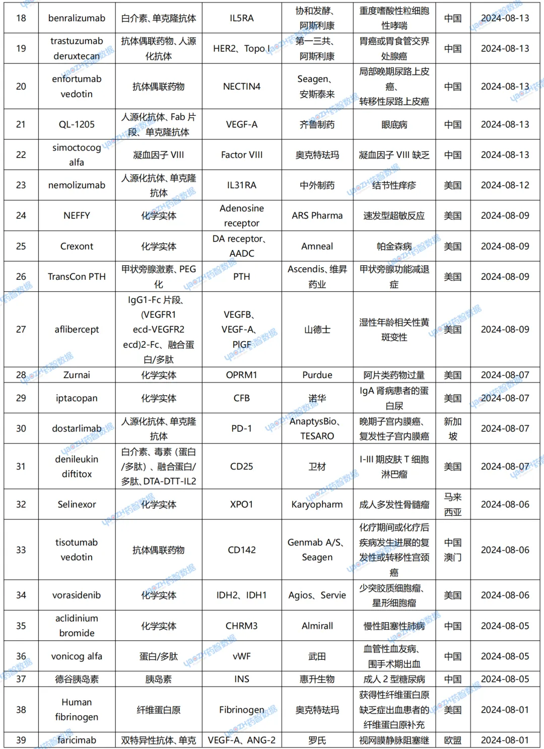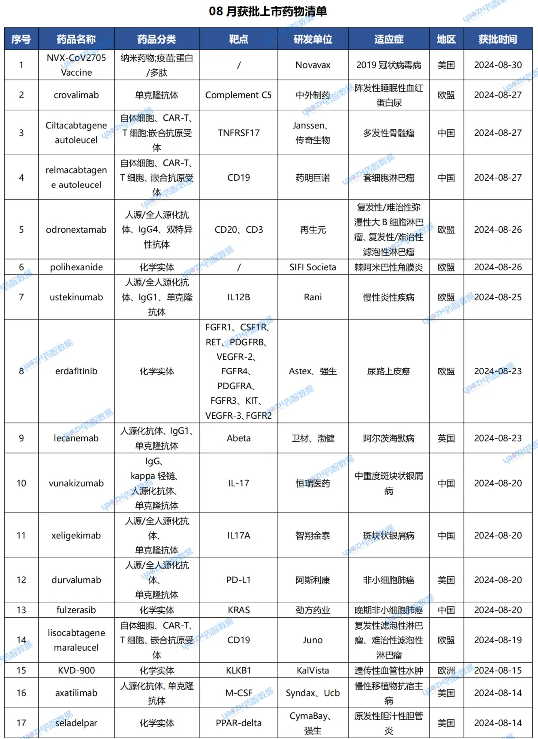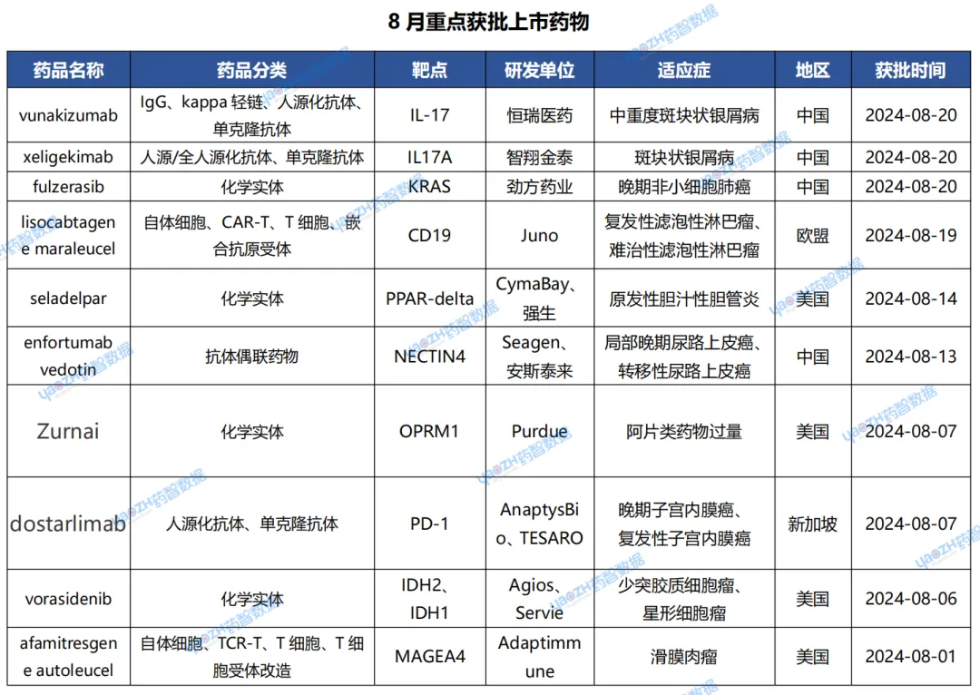 据全球药物分析系统数据库统计,8月全球共40款药物获批上市(包括新获批适应症),其中境外26个上市药品,中国境内14个药品,下表展示部分重点上市药物,文末附完整清单,更多药品信息可通过全球药物分析系统进行查看。