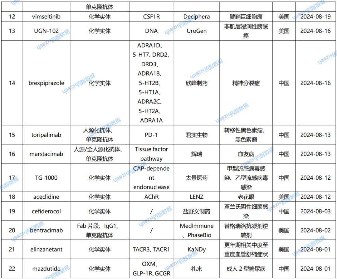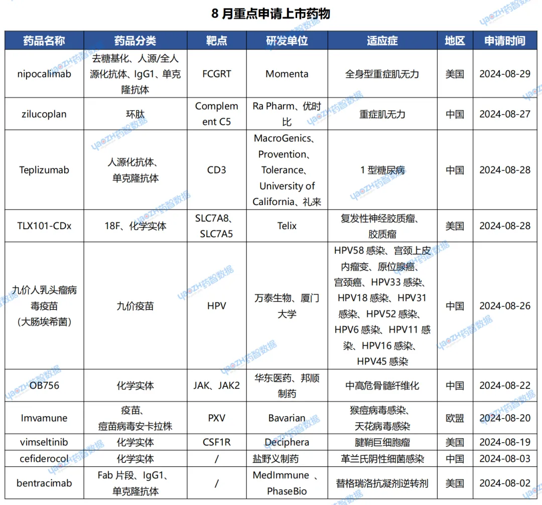 据全球药物分析系统数据库统计,8月全球共22款药物申请上市(包括首次申请和新申请),下表展示部分重点申请上市药物,文末附完整清单,更多药品信息可通过全球药物分析系统进行查看。