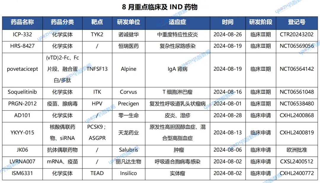 据全球药物分析系统数据库统计,2024年08月“首次”进入重点临床试验(三期)的新药项目有26个,临床申请有71个,下表展示部分重点信息,完整信息可通过全球药物分析系统进行查看。