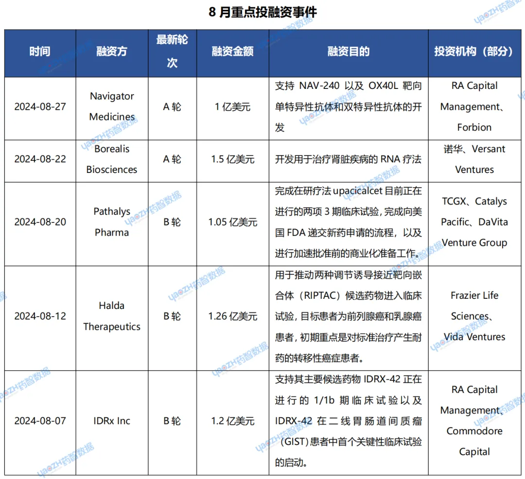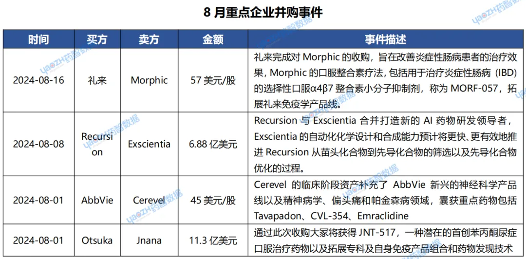 据市场投资格局统计,2024年08月共294条医药交易事件、163条医药投融资事件和43项企业并购事件发生,重点交易信息如下,完整清单详见市场投资格局数据库。
