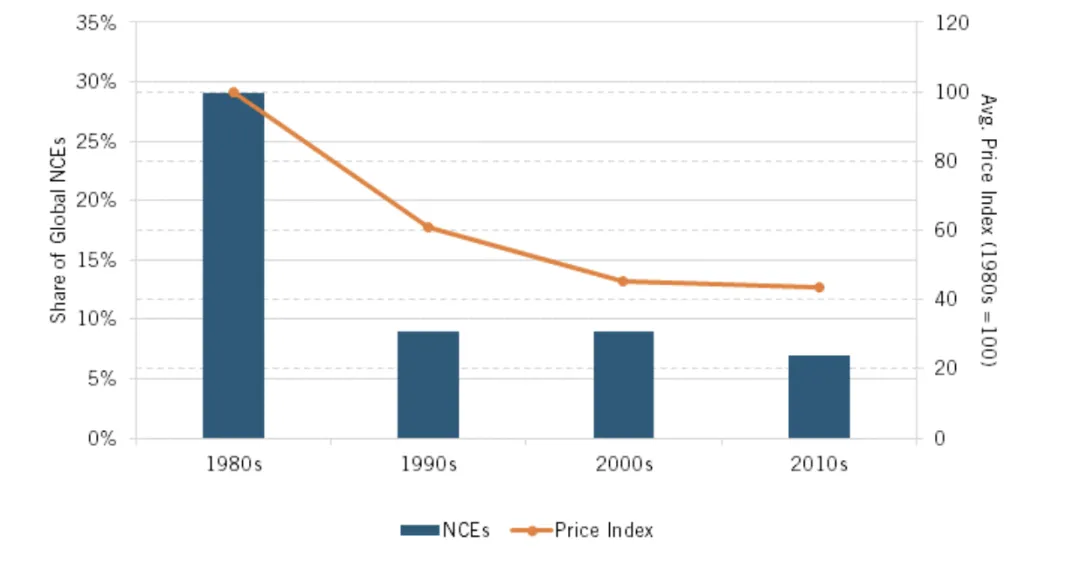 日本的制药业在20世纪80年代达到了顶峰,至少就NCEs 数量的全球占比而言是这样的,而价格控制政策在20世纪80年代早期开始生效,由于药物可能需要十年或更长时间才能开发出来,价格管制对药物创新的影响随着时间的推移变得更加明显。