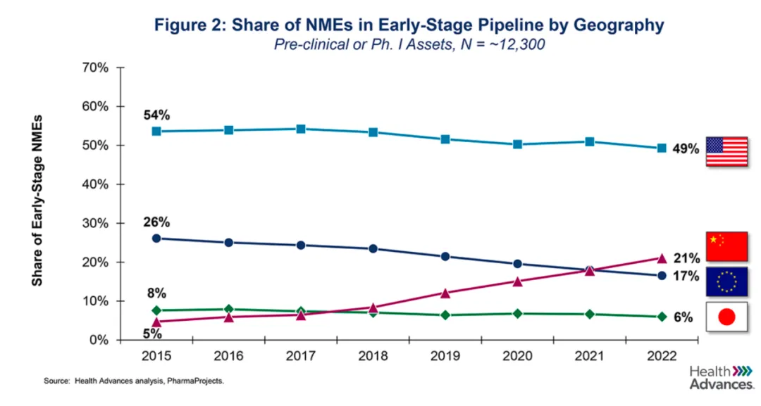 在这种政策之下,制药公司需要一个较长的时间来收回投资,然后才能重新投入于研发。这对早期创新产生了重大影响,2015年到2023年,源自日本的临床早期项目资产数量全球占比从8%下降到6% 。另一方面,同期中国临床早期资产的份额从5% 飙升至惊人的21% 。